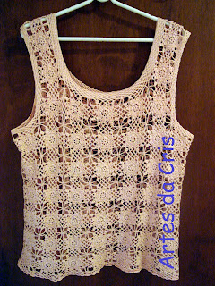 Fiz esta blusa há mais de 6 anos. Era para ter mangas longas mas na época eu não tinha muito tempo, a linha acabou, estava calor, aí eu decidi deixar sem mangas. Super fresquinha! Dá para tirar a receita pela foto. Ela é feita de motivos que são emendados conforme a gente vai terminando a última carreira de cada motivo, e não depois de todos prontos. Fica invisível a emenda. Aí eu fiz um barrado de alças de correntinhas, super fácil e ficou legal. Podem copiar à vontade! Já pensaram em preto, branco, marrom?